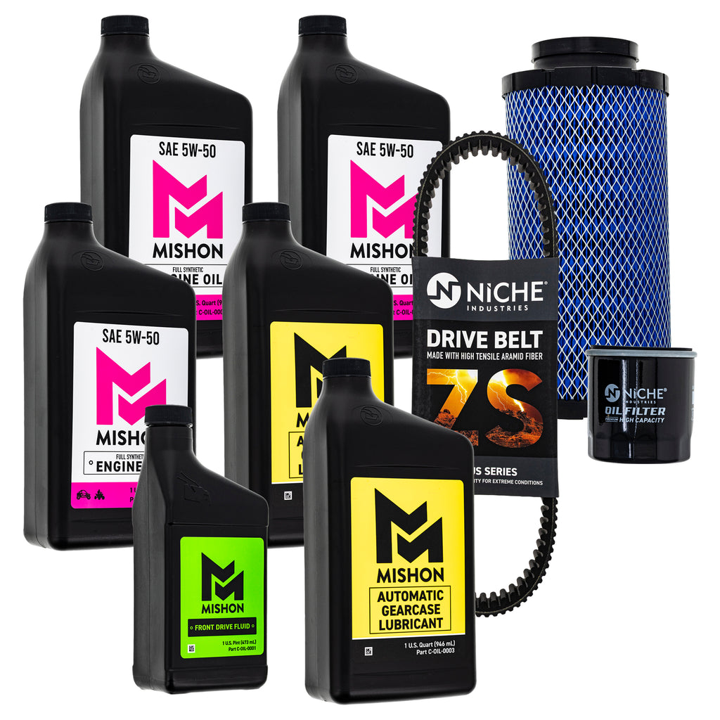 Whats Included (1) Drive Belt, (3) Quarts of Oil, (1) Pint of Front Drive Fluid, (2) Quarts of Gearcase Lubricant, (1) Air Filter, (1) Oil Filter, (3) Funnels