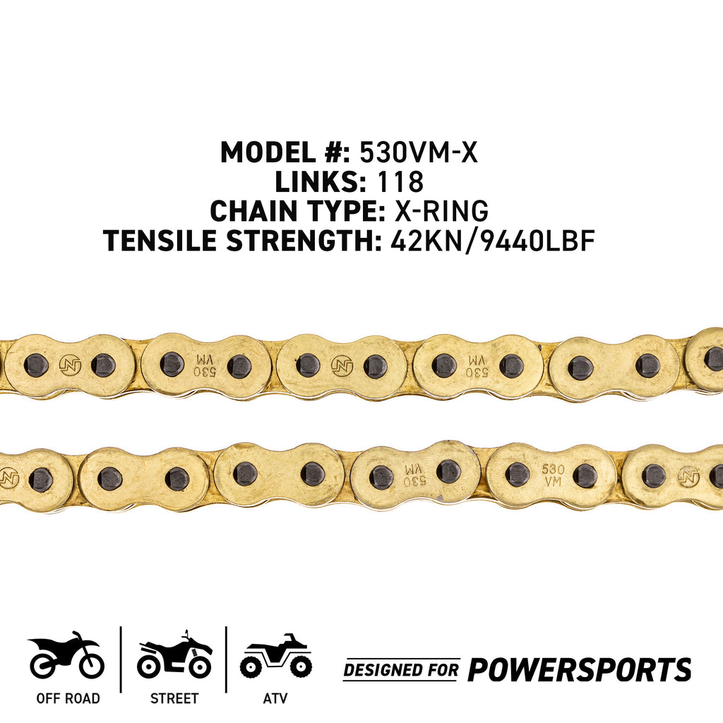 NICHE 519-CDC2583H Gold X-Ring Chain 118 w/ Master LinkSubstitute For OEM Part Numbers(s): 9Y581-69117-00, 94582-22118-00, 94582-11118-00, 94582-10118-00, 92057-0579, 27600-24F60-118, 27600-21E00-118, 27600-16G00-118