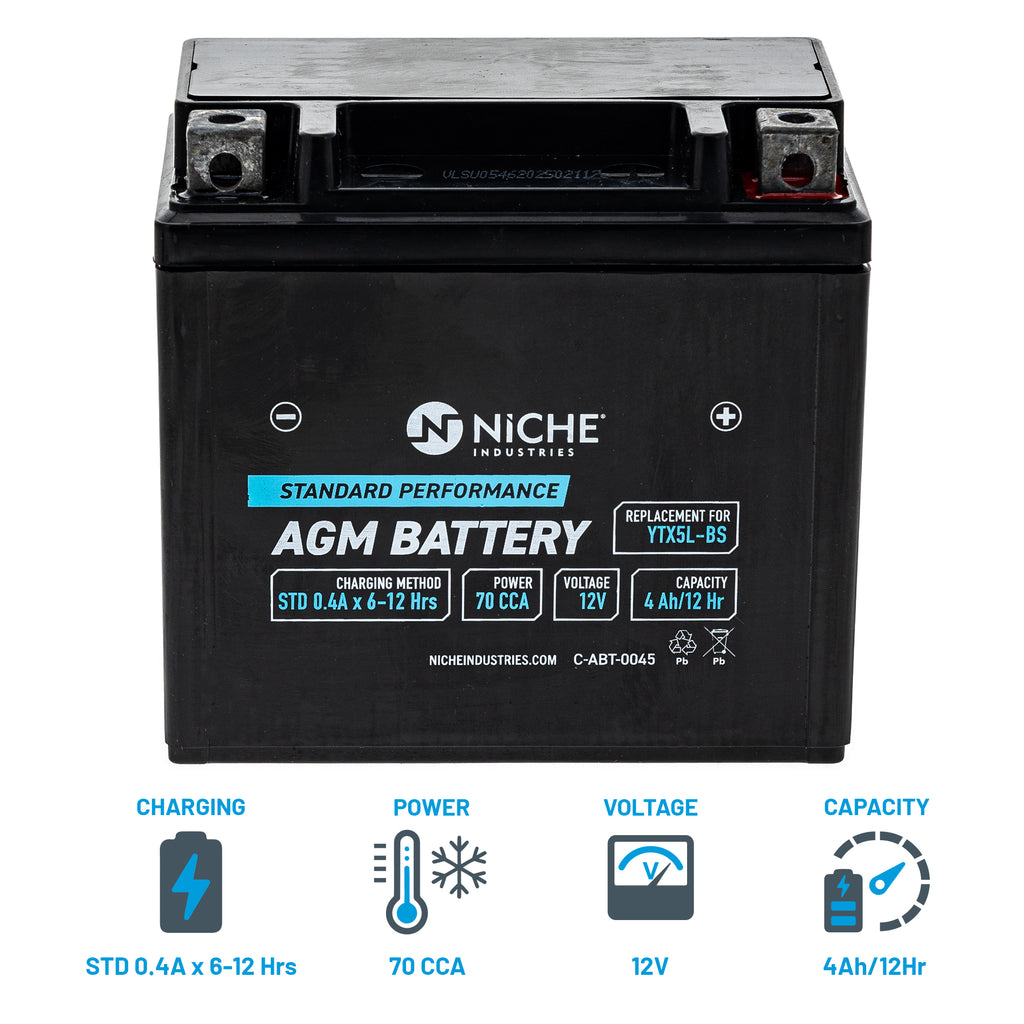 Included in This Kit: (QTY 1) NICHE 519-CAB2267T AGM Battery Substitute For OEM Part Numbers(s): 3307-656, 3303-131, 3301-866, 31500-KY4-905, 31500-KRP-982, 31500-KRP-981, 31500-HP2-671, 31500-GE1-778AH, 31500-GE1-778, 31500-GE1-777, 31500-GE1-775, 31500-GE1-774, 31500-GE1-773, 31500-GE1-772, 31500-GE1-771, 31500-GE1-671 (QTY 1) NICHE 519-CBC2223H Automatic Battery Charger 12V 750ma Substitute For OEM Part Numbers(s):